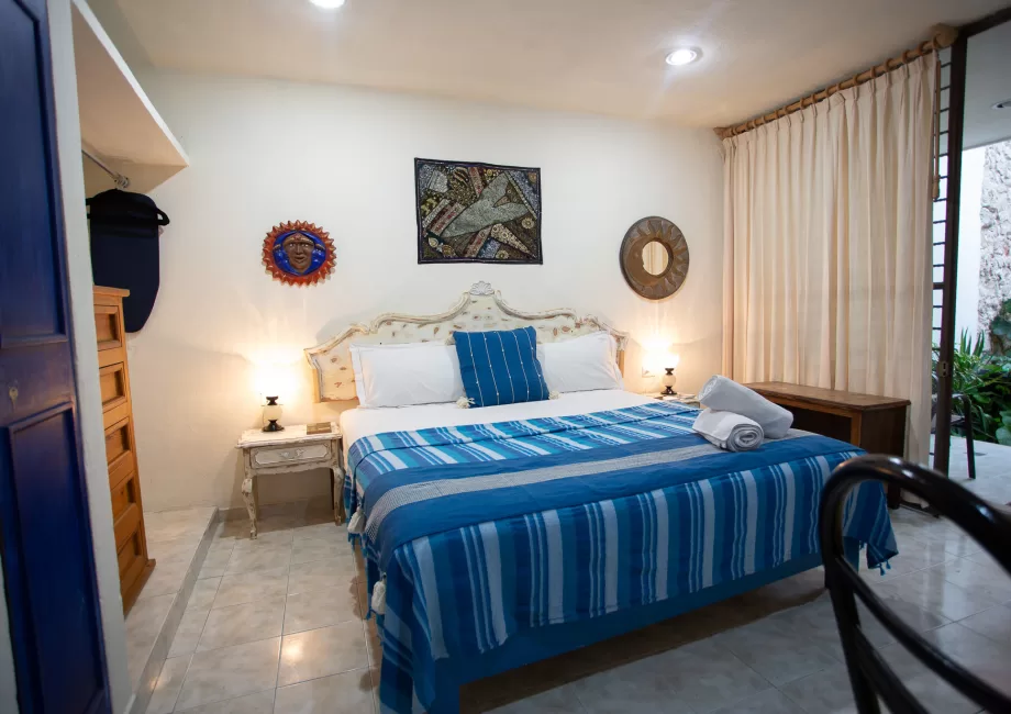 AMATE cuenta con una colección de pinturas tradicionales pintadas en papel hecho a mano de la corteza del árbol Amate. Decorado con azules y turquesa, te brinda la frescura y comodidad para una estancia placentera. Esta habitación cuenta con una cama Queen Size, un ventilador de muro, aire acondicionado y baño privado.
